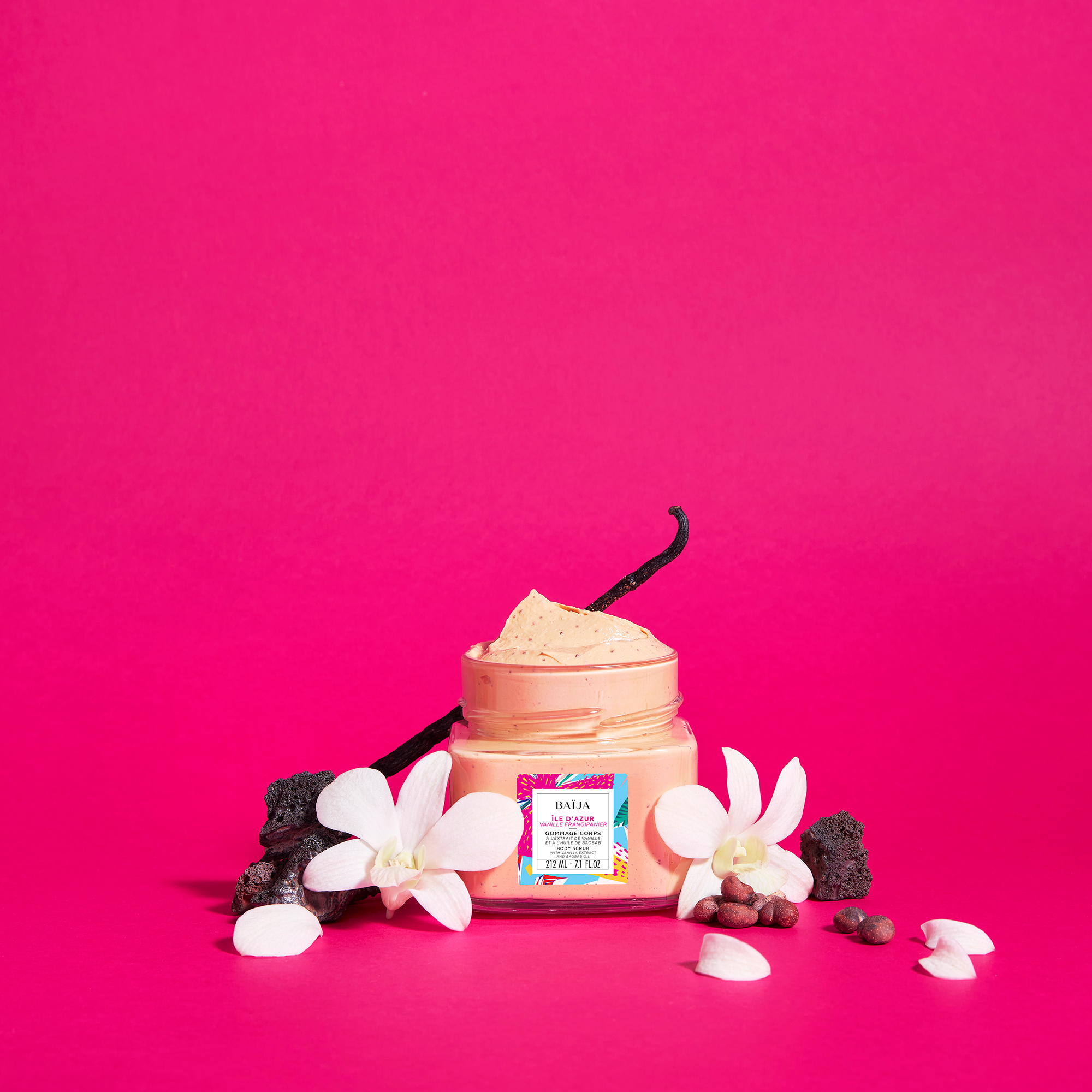 Sa texture onctueuse associe le sel de mer et les coques de Noix de Coco pour exfolier en douceur la peau et la débarrasser de ses impuretés. L’extrait d’Ananas illuminateur et l’huile de Noix du Brésil nourrissante la subliment dès la première utilisation. Son parfum de fruits frais et de fleurs solaires invite au voyage, à la recherche d’un paradis exotique..