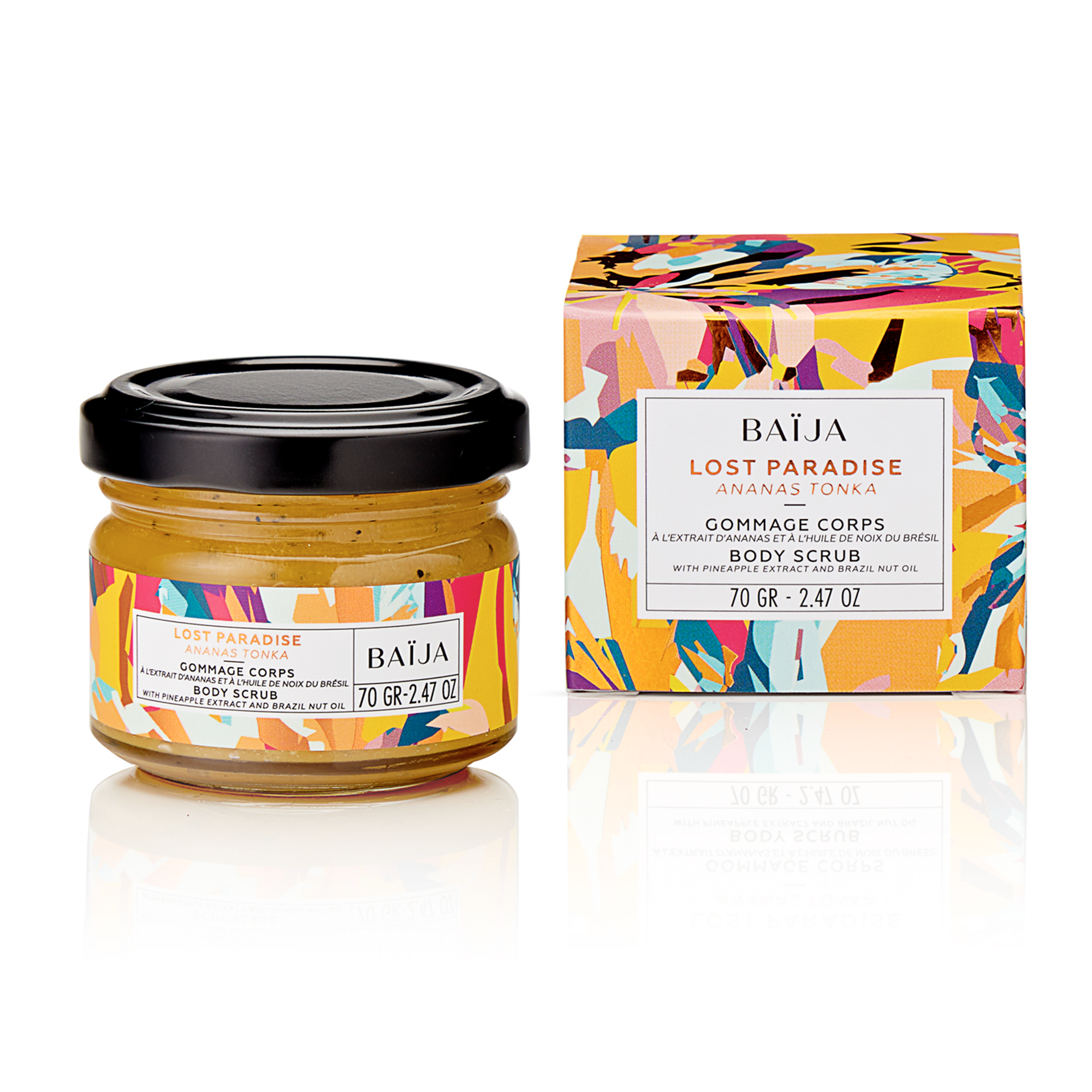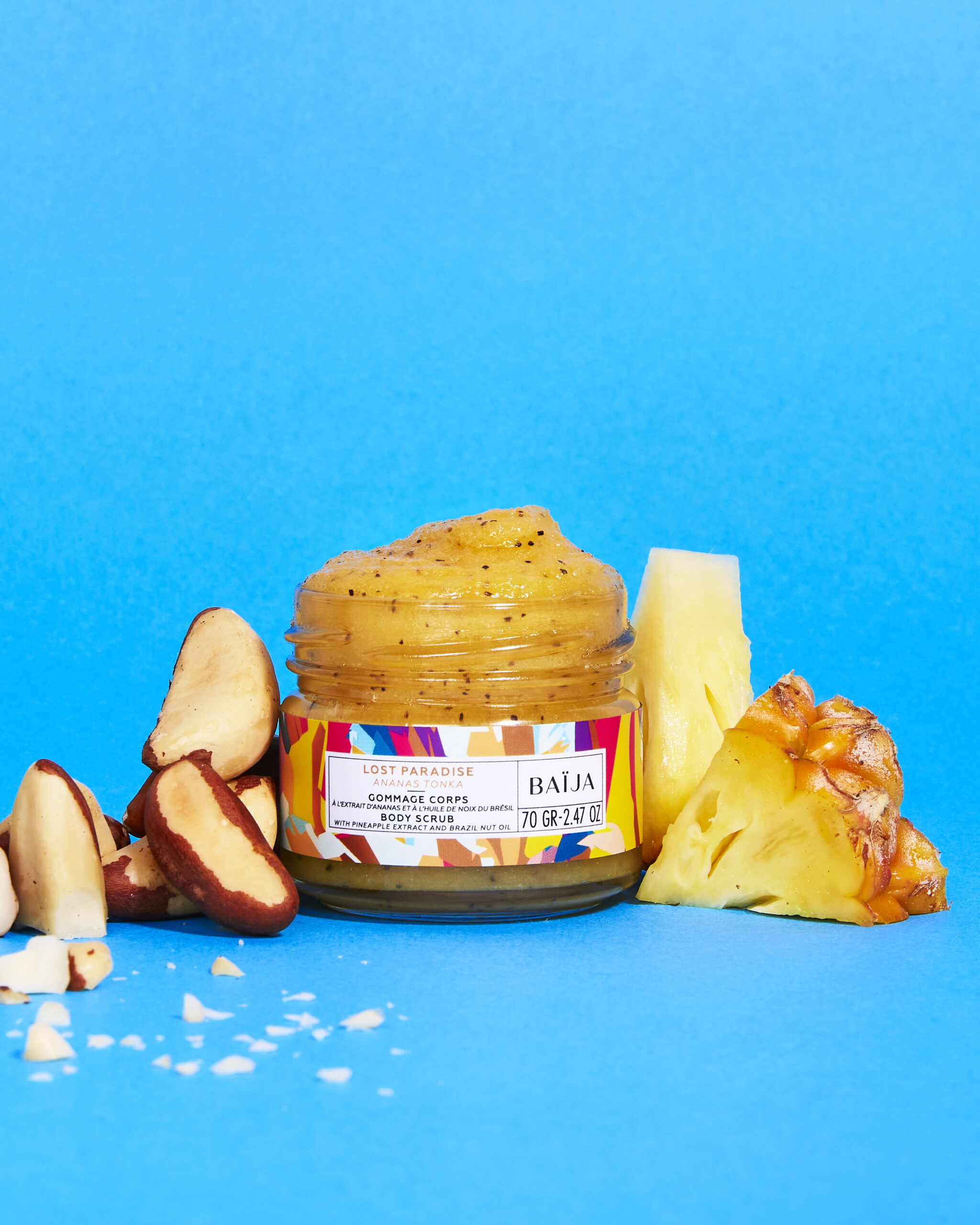 Sa texture onctueuse associe le sel de mer et les coques de Noix de Coco pour exfolier en douceur la peau et la débarrasser de ses impuretés. L’extrait d’Ananas illuminateur et l’huile de Noix du Brésil nourrissante la subliment dès la première utilisation. Son parfum de fruits frais et de fleurs solaires invite au voyage, à la recherche d’un paradis exotique.