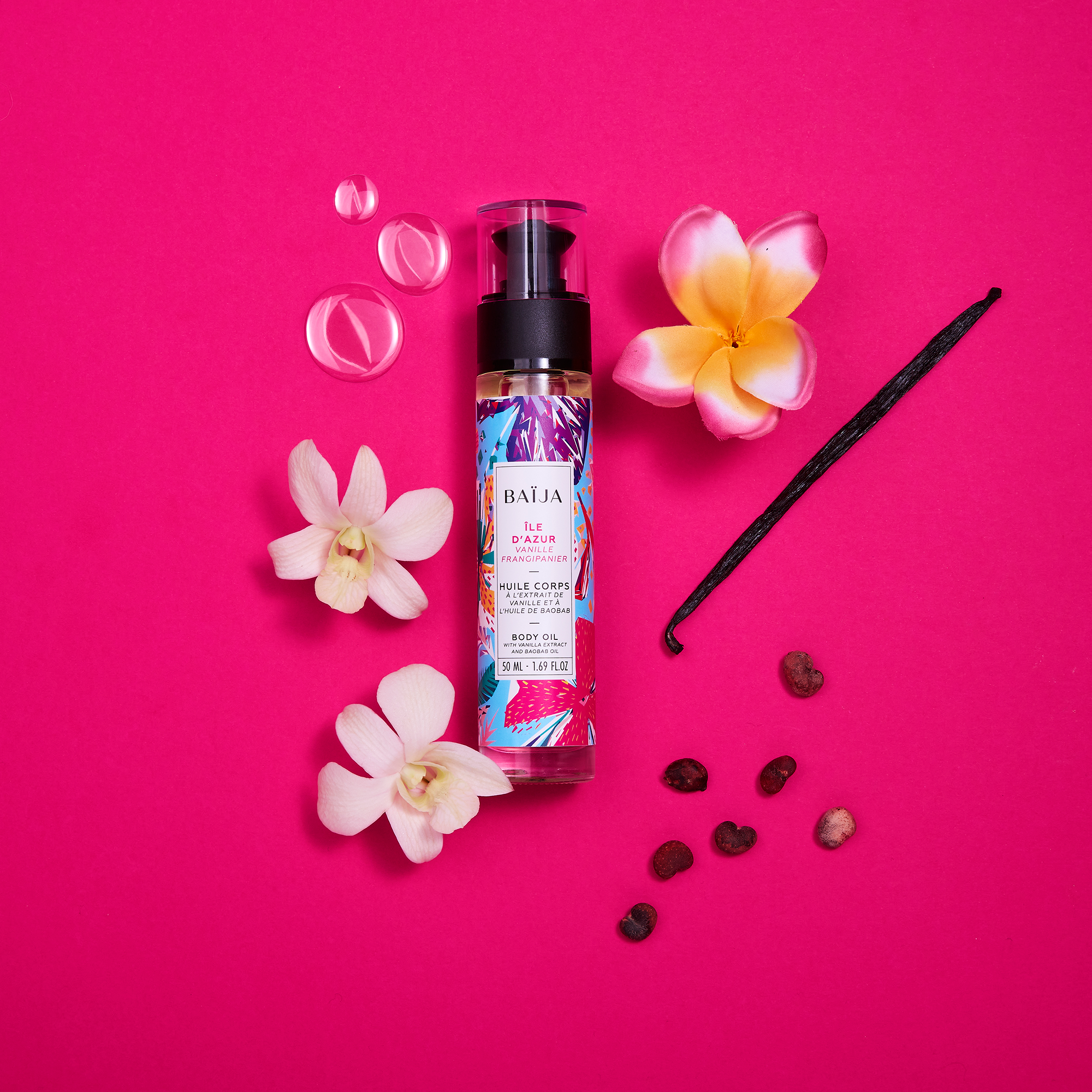 Sa formule contient un extrait de Vanille aux fonctions Antioxydantes et Illuminatrices, des huiles de Baobab Nourrissante et Revitalisante, de Sésame Assouplissante et de Pépins de Raisin aux propriétés Régénératrices pour une peau délicate et veloutée.